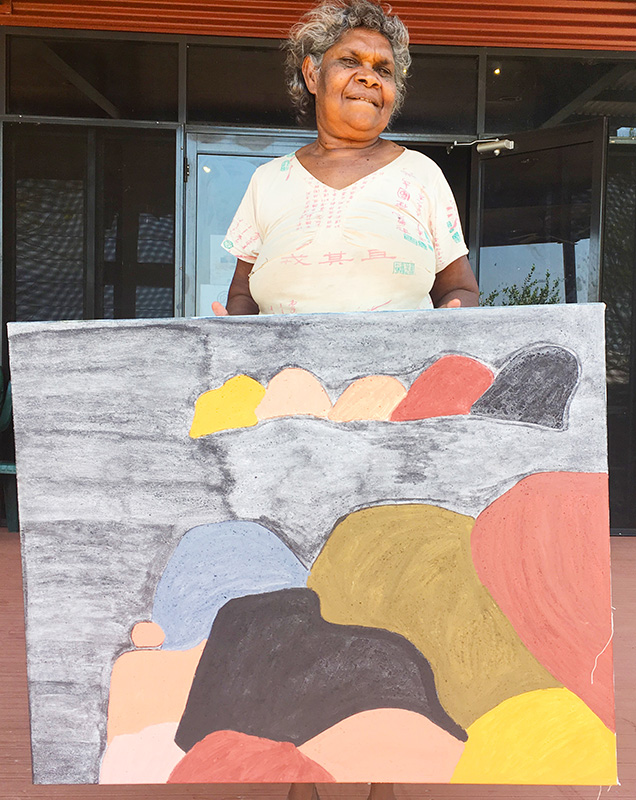 Evelyn Malgil was born in Derby and moved to Warmun when she was ten. Evelyn went to high school in the town of her birth and then returned to Warmun. Evelyn worked on Bedford Downs cattle station with her husband Norman Echo. Evelyn cooked, while Norman was the head stockman. Bedford Downs Station is located southwest of Warmun Community. It is Norman’s traditional country. Following her return, Evelyn has remained in Warmun were she now lives with her five children and her family.