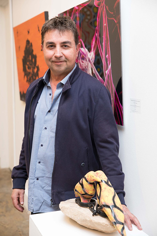 Graham Toomey is an emerging Aboriginal artist from the Wiradjuri and Wongaibon Aboriginal nations of western New South Wales.“All my life I have always loved art. At school I always looked forward to the art class and I remember how good it made me feel. Those feelings still live with me today and I feel blessed that it’s a part of my life. I also feel blessed to be an Aboriginal from the Wiradjuri and Wongaibon lands and to feel the belonging and connection to not only my own homelands, but to the land and to its water whereever I journey. While I was studying Aboriginal art some years ago, I constantly felt a spiritual force or presence with me while I was creating. I feel this spiritual happening was, and are, my ancestors, who provide knowledge, ideas and thoughts to create works. I feel this is their way of connecting to me and to this world, while I connect to them and to their world.
