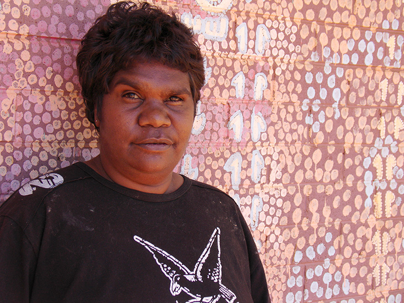 Judith Nungarrayi Martin was born in 1976 in Alice Springs Hospital, the closest hospital to Yuendumu, a remote Aboriginal community 290 km north-west of Alice Springs in the Northern Territory. Judith comes from a family of artists. Her mother is Helen Nampijinpa Robertson and her grandfather is Shorty Jangala Robertson, both well-known artists who paint for Warlukurlangu Artists. She attended the local school in Yuendumu before studying at Yirara College, an Aboriginal boarding college in Alice Springs. When she finished school she returned to Yuendumu. She moved to Nyrripi in 1991 where she later married a ‘Nyrripi boy’. They have three sons and one daughter.
