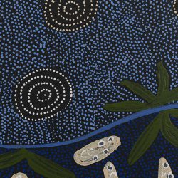 Lola Nampijinpa Brown was born in Ti-Tree, a small community 193km north of Alice Springs in the Northern Territory. As a child her family moved to Willowra where she grew up and went to school. It is in Mt Allen that Lola married her first husband, to whom she was “promised”. They were married at Mt Allen and had seven children, four boys and three girls. Lola was a regular artist at the Mt Allen art centre. This art centre has since closed and she now divides her time between Alice Springs and Yuendumu. She has been actively working at Warlukurlangu Arts in Yuendumu since 2002. It was at Yuendumu that Lola met her present husband, Christopher Japangardi Poulson who is also a well-respected artist from that area. Lola paints water dreaming (Ngapa Jurkurrpa) stories associated with Pikilyi (Vaughan Springs). This is a large and important waterhole near Mount Doreen Station. These stories have been passed down to Lola from her mother and aunties – much the same as they have been passed on for thousands of years.