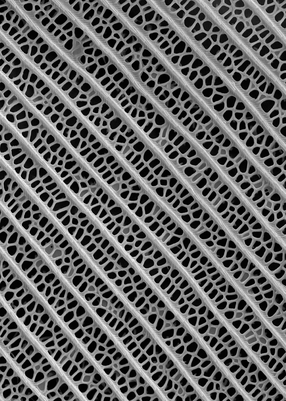 The micro-structure of a scale from a butterfly wing. Moth and butterfly wings use pigments to make some colours but physical structures, that affect the behaviour of light itself, to make others. Understanding how they do this lets us mimic nature and create similar features in manmade products.