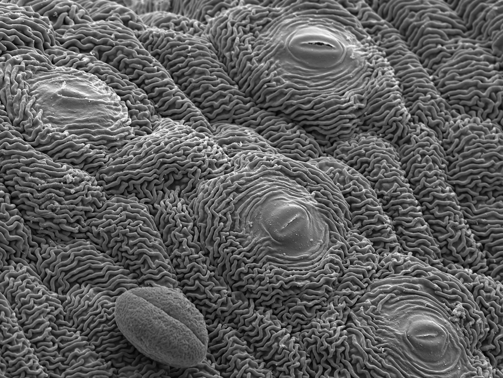 Surface of a grass bud showing four stomata and a pollen grain that has fallen from a flower. Stomata are pores that open and close to control the flow of gases into and out of the leaf. They also let water out of the plant during transpiration. All the stomata are closed on this leaf.