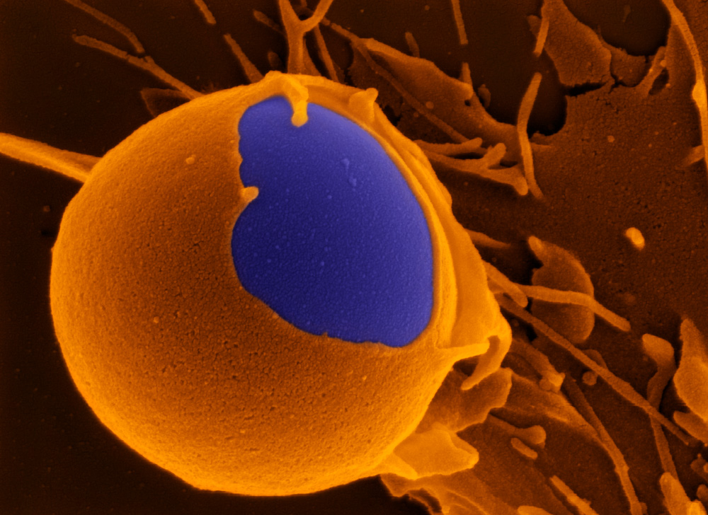 Search and destroy! This image shows us how an immune cell, called a macrophage (orange), attacks foreign bodies like bacteria – or this microbead (purple) – completely engulfing it so it can be broken down deep within the cell. Molecules on the surface of foreign bodies signal danger to the macrophage cell, which attacks and swallows them. This helps keep the body free of infection – most of the time.