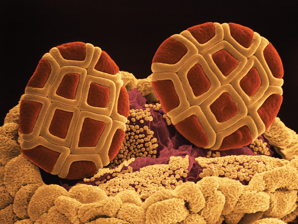 Two pollen grains from our national flower, the wattle. The pollen’s outer coat protects and helps deliver plant sperm to the ovum to make seeds that will grow into baby plants. The patterns on the pollen help us identify the plant it comes from.
