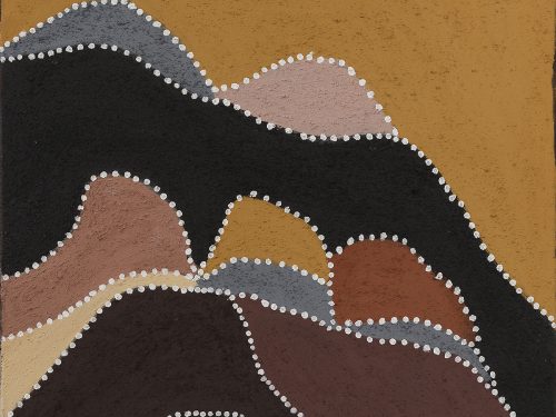 This painting shows the hills of Gordon’s country – Birnoo Country. Gordon was born there, and when he grew up, he mustered cattle all throughout this country for many years – the way his father taught him to. This Country today covers what is currently known as Alice Downs Station.