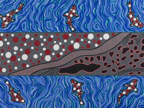 This artwork traps an ancient world in with the modern world. Our ancient people, culture and land have endured and so have our stories, values, beliefs and traditional practices. My ancient people are freshwater people who lived and survived along the many waterways of our land.