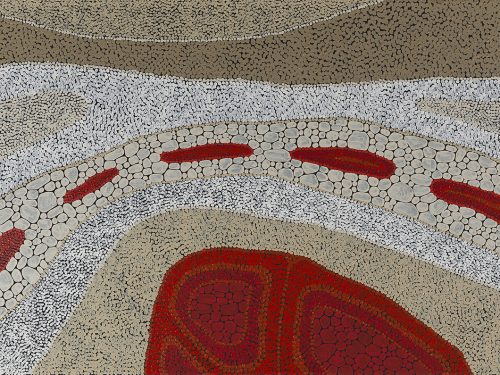 The painting is about a dry river bed. The big red area at the bottom is our camp – it is alive. The red water holes still have life. The red is the life blood.