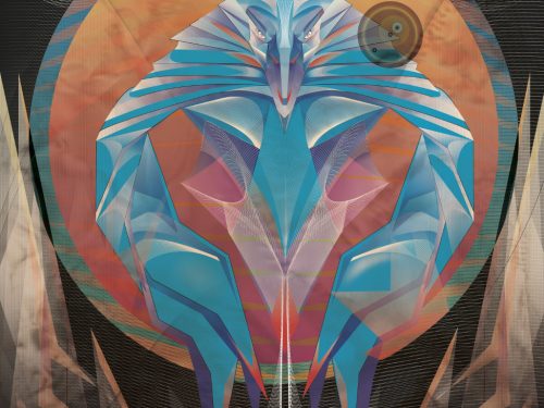 The patterns show a complex array of overlapping and disrupted crystals in a piece of quartz. The Flinders Ranges are made up of quartz-containing rocks and it is these that give the name to the Adnyamathanha – rock people. This structure can be seen underlying the image of Yulu the kingfisher man.