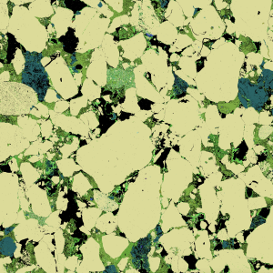 The micrographs in this exhibition were created on transmission electron microscopes (TEMs) where an electron beam passes through a very thin slice of the sample being examined. This gives a flat-looking image, rather like an aerial view of the sample. Where there are denser parts, the electron beam is blocked and a dark area is created on the image. Where there is less material, the beam goes through easily and shows up as a lighter area on the image. These images can only be captured in black and white as no visible light is involved in the imaging process.
