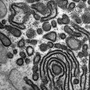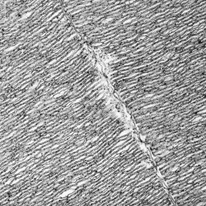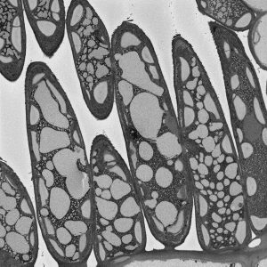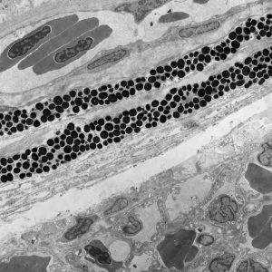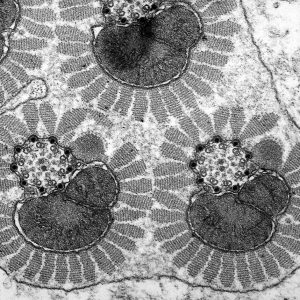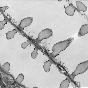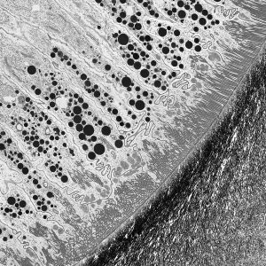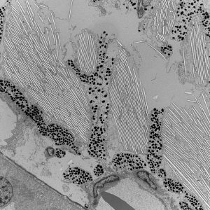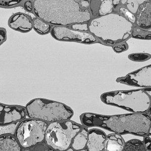 The micrographs in this exhibition were created on transmission electron microscopes (TEMs) where an electron beam passes through a very thin slice of the sample being examined. This gives a flat-looking image, rather like an aerial view of the sample. Where there are denser parts, the electron beam is blocked and a dark area is created on the image. Where there is less material, the beam goes through easily and shows up as a lighter area on the image. These images can only be captured in black and white as no visible light is involved in the imaging process.